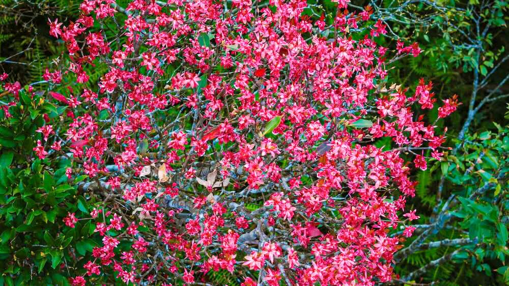 Đỗ quyên hoa chuông vươn cao tới 5m, hoa trắng và đỏ nổi bật giữa nền rừng xanh thẫm.