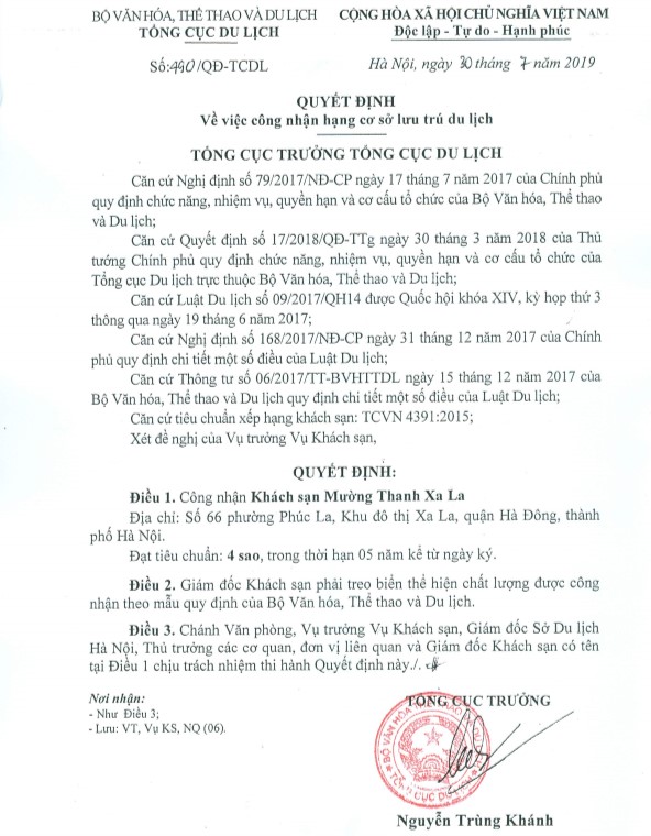 Mường Thanh Grand Xa La nhận quyết định công nhận hạng khách sạn 4 sao của Tổng cục Du lịch Việt Nam.